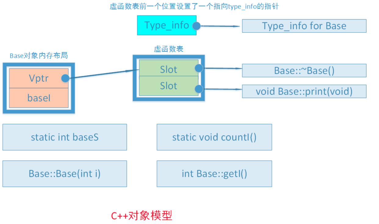 对象只包含非静态成员变量和vptr 虚函数指针 指向类生成的虚表。